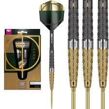 The Elysian-inspired grip features a distinctive black and gold performance coating containing a number of cells throughout for a strong yet subtle grip texture. The stunning engineered barrels flow into the high performance Pro Grip EVO shafts finished with flights that feature accents of deep green for a truly special look for a complete dart inspired by a luxury lifestyle aesthetic. The front-tapered barrels are completed with gold Swiss Points, Target's patented interchangeable points for a truly customisable dart.